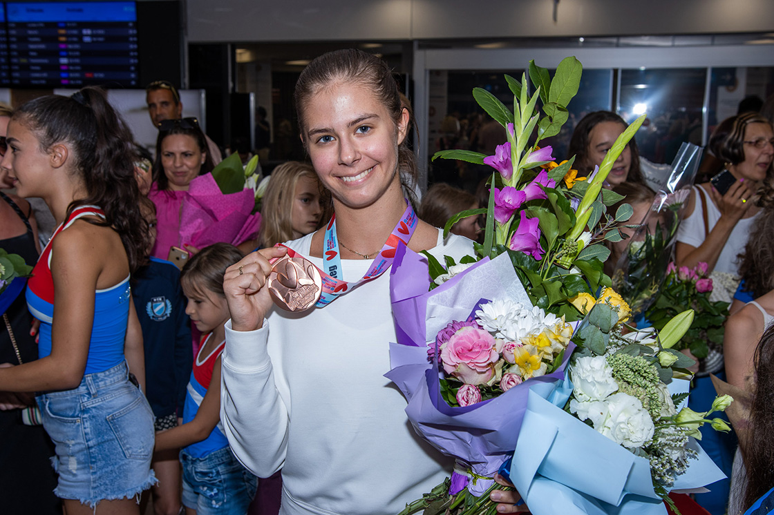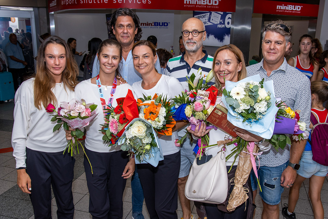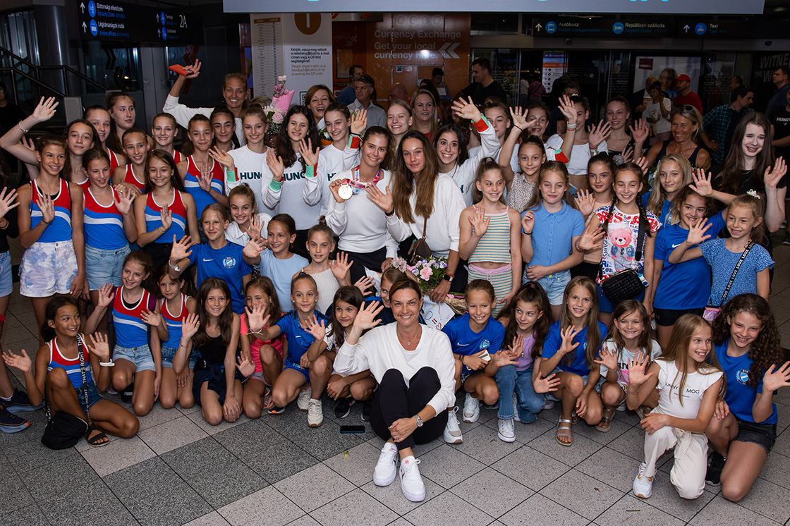 Családtagok, barátok, és rg-s növendékek temérdek virágcsokorral várták a hétfő esti érkezést a Liszt Ferenc Nemzetközi Repülőtéren, ahol a hazatérők, élükön Pigniczki Fannival boldogan pózoltak a fotósok előtt.